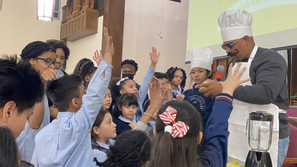 The series concluded with a special event featuring “Chef Curie,” a playful character created by Genao to help illustrate the message in a hands-on way. During the culminating activity, students watched as different types of fruit—each symbolizing a specific virtue—were blended together, representing the unity and transforming power of the Holy Spirit in a believer’s life.