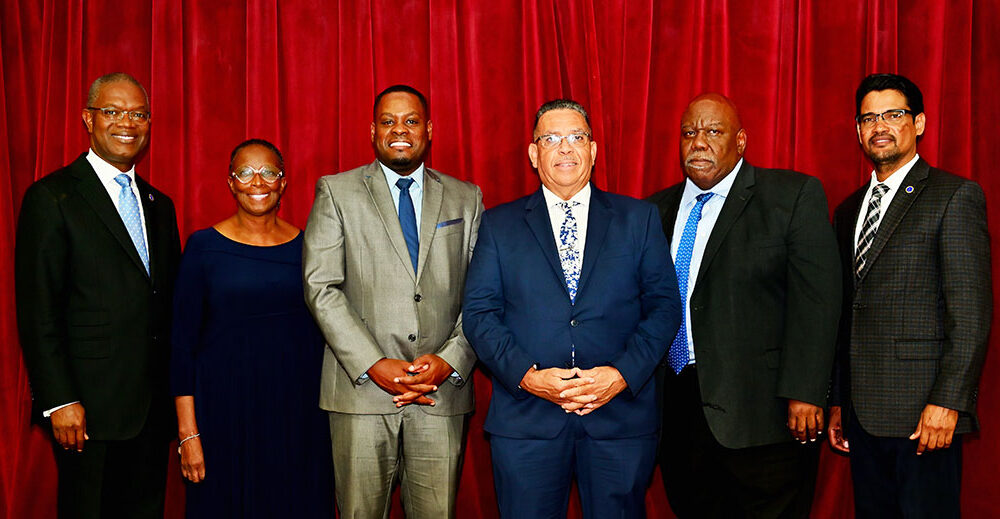 Atlantic Union Conference administrators, Pierre E. Omeler, president, left, and Elias F. Zabala, Sr., right, pose with newly-elected administrators for the Bermuda Conference, Kenneth Manders, president, center; W. DeJaun Tull, executive secretary, third from left; Aaron Spencer, interim treasurer, second from right; and Rosemary Tyrrell, superintendent of schools. [Photo: Ricardo Clarke]