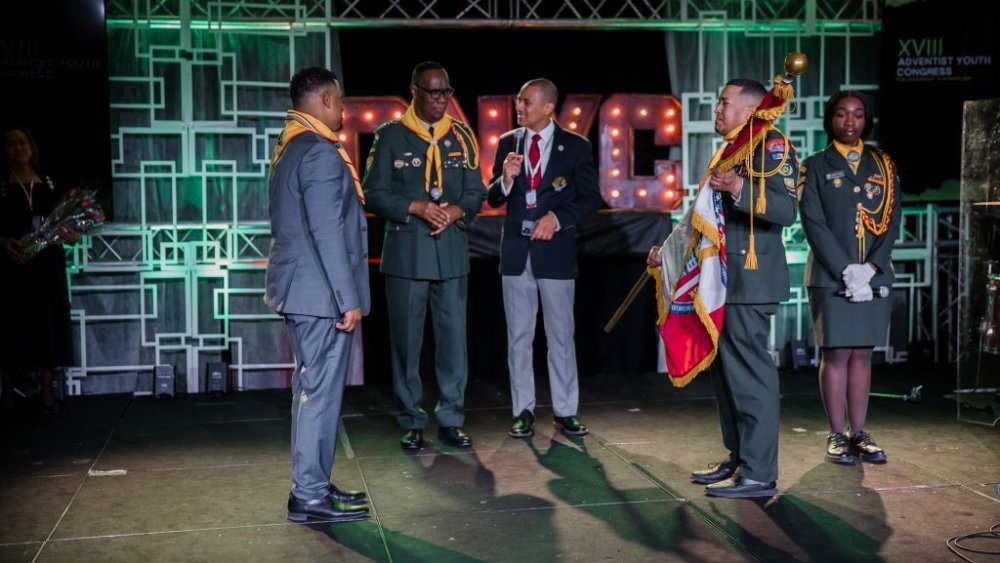 Photo: Enmanuel Contreras, front right, Atlantic Union Conference vice president of Youth and Young Adult Ministries and former GNYC Youth Ministries director, prepares to pass the Pathfinder flag to Christian Genao, newly elected GNYC Youth Ministries director, as GNYC administrators Alanzo Smith, rear left, president, and Ariel Manzueta, executive secretary, center, observe the symbolic ceremony.