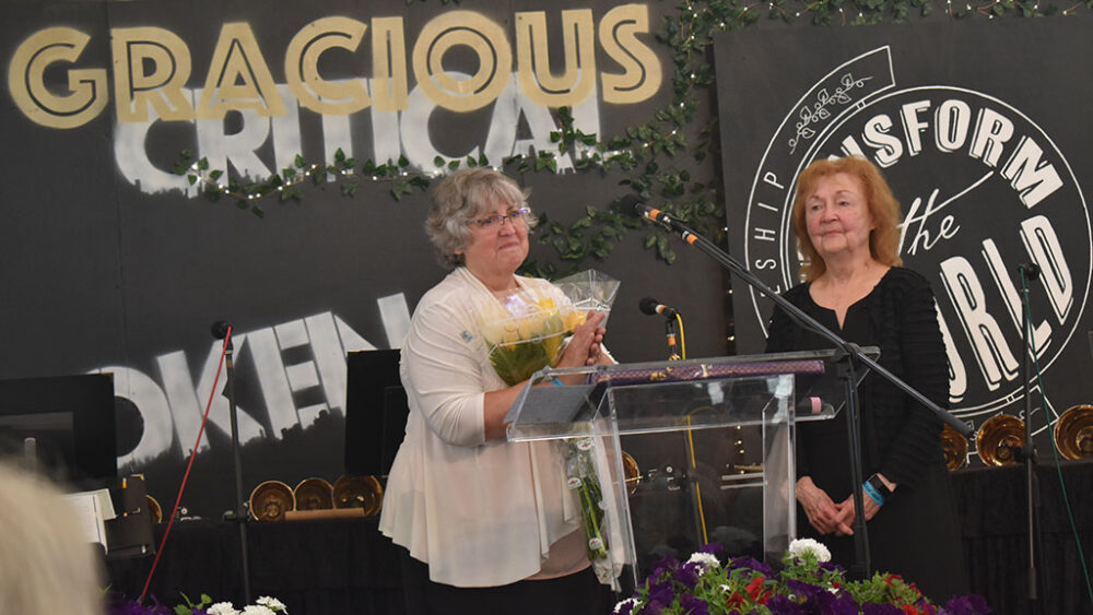 Sonia Edwards, Northern New England superintendent of schools, left, shows appreciation to Dotty Krueger, right, for her many years of service. [Photo: Northern New England Conference]