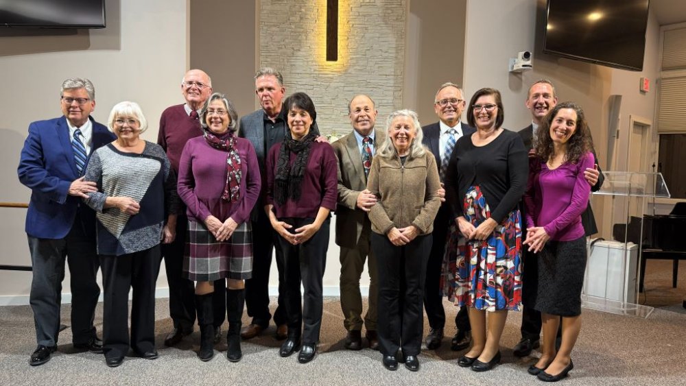 Photo: Former Cape Cod church pastors and their wives, from left, George and Susan Whitsett, Cliff and Sue Gleason, Steve and Tina Jencks, Mark and Pam Gagnon, and John and Carmen Piroski, pose with Chuck and Christina Holtry, the current church pastor and his wife.